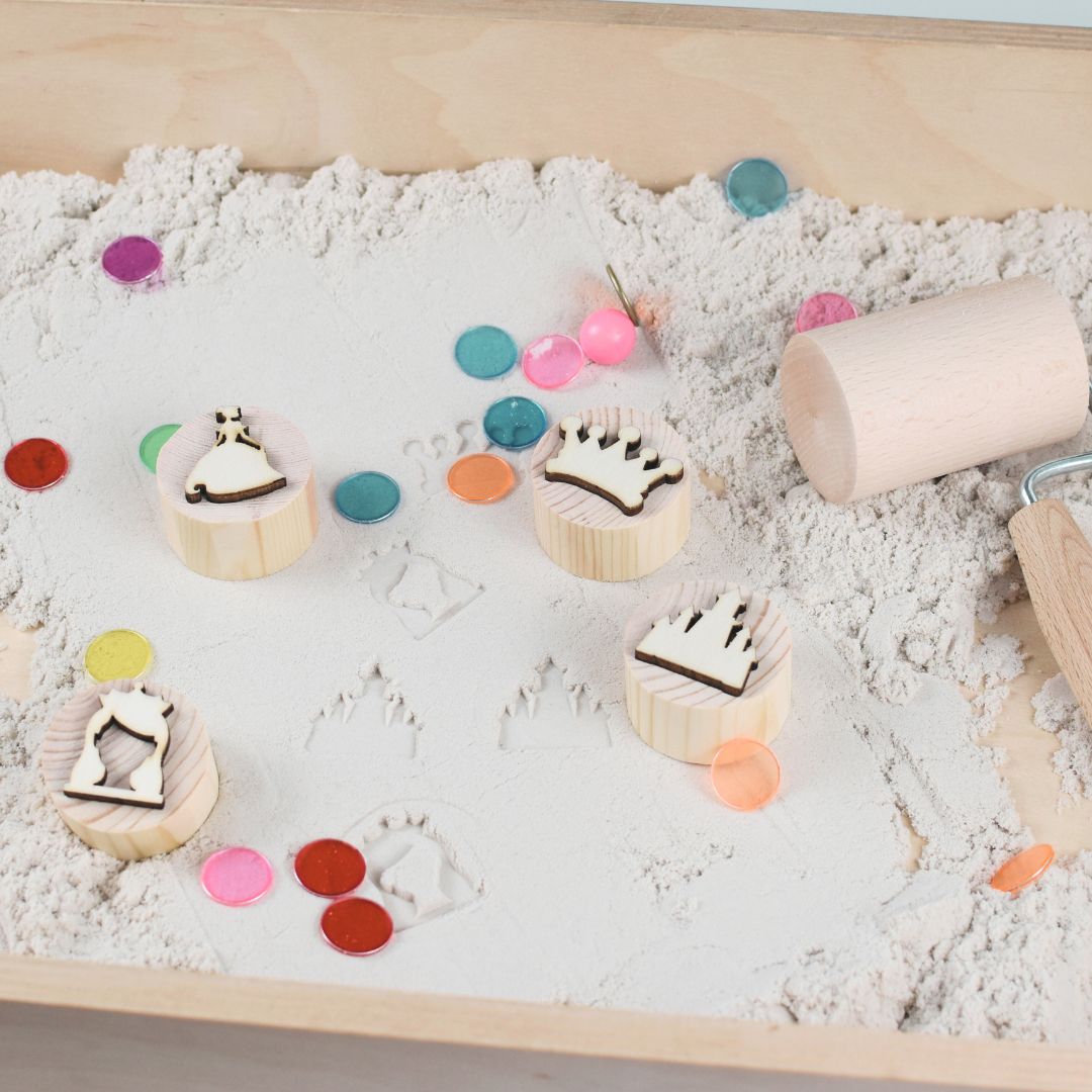 Erwecken Sie ein Märchen zum Leben mit diesen bezaubernden Holz-Prinzessinnen-Stempeln! Perfekt für endloses magisches Spiel im kinetischen Sand. Dieses Set besteht aus vier einzigartigen Stempeln mit Prinzessinnen-Elementen wie einem Schloss, einer Krone, einer Prinzessin und einem wunderschönen Ballkleid.
