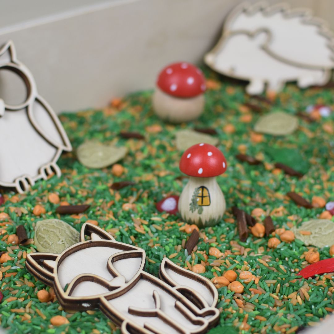 Die Mischung besteht aus grünem und orangem Spielreis, leuchtenden orangen Spielbohnen, kleinen Holzstäbchen und dekorativen Herbstblättern. So entsteht eine bunte, naturinspirierte Spielwelt, die Kinder immer wieder neu entdecken können.
