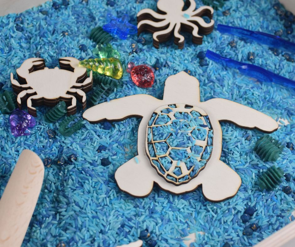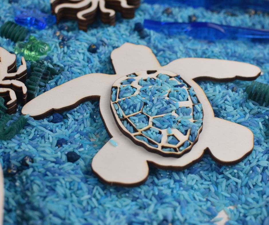 Tauche ein in die Welt der Ozeane mit dieser niedlichen Schildkröten-Füllform aus Holz! Kinder können sie mit Spielreis, Erbsen oder anderen Materialien befüllen – für fantasievolles, sensorisches Spielen.
