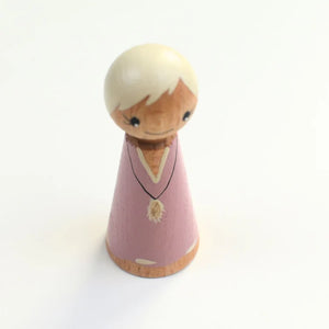 Diese liebevolle Mutterfigur mit blondem Haar strahlt Ruhe, Geborgenheit und Wärme aus. Ihr zartes Erscheinungsbild, kombiniert mit einem lila Kleid und einer feinen Kette, macht sie zu einer herkenbaren Figur innerhalb jedes Holzfamilien-Sets.