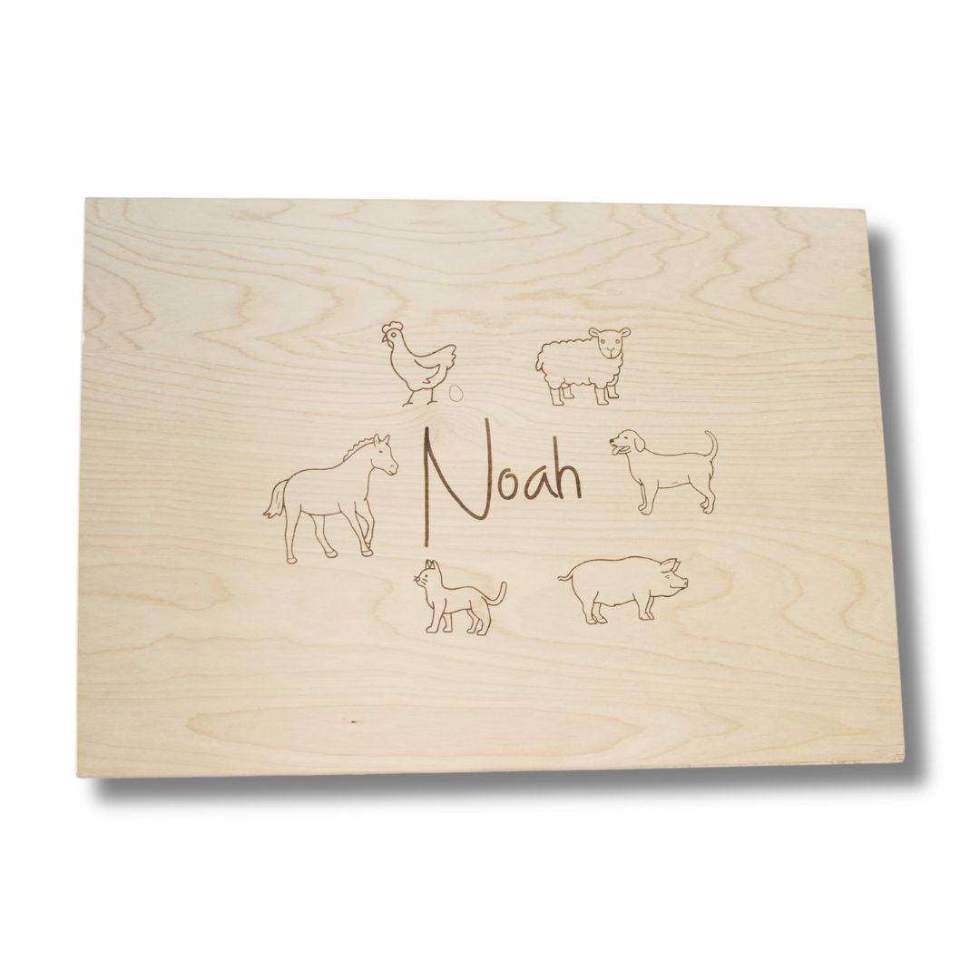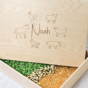 Der Deckel der Kiste kann mit einem Namen und Bauernhofmotiven personalisiert werden.