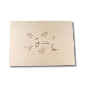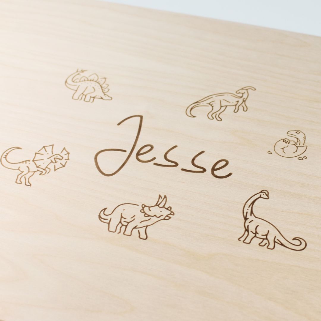 Der Deckel kann mit einem Namen und Dinosauriermotiven personalisiert werden.