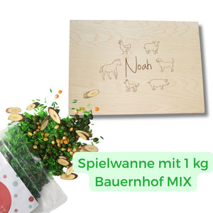 Holz-Spielwanne + 1 kg Bauernhof Mix – SET-Rabatt – mehrere Designs verfügbar