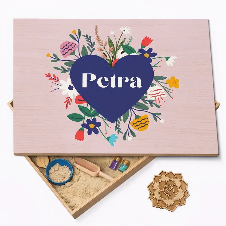 Frühlingsgefühle zum Anfassen: Diese personalisierte Holz-Spielwanne vereint ein liebevolles Herzdesign mit einer blühenden Blumenkomposition in frischen Farben. Der Name deines Kindes steht im Mittelpunkt – eingebettet in ein stilvolles Herz, umrahmt von floralen Details.
