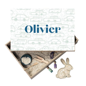 Holz-Spielwanne mit personalisiertem Deckel – Olivier (Fahrzeuge)