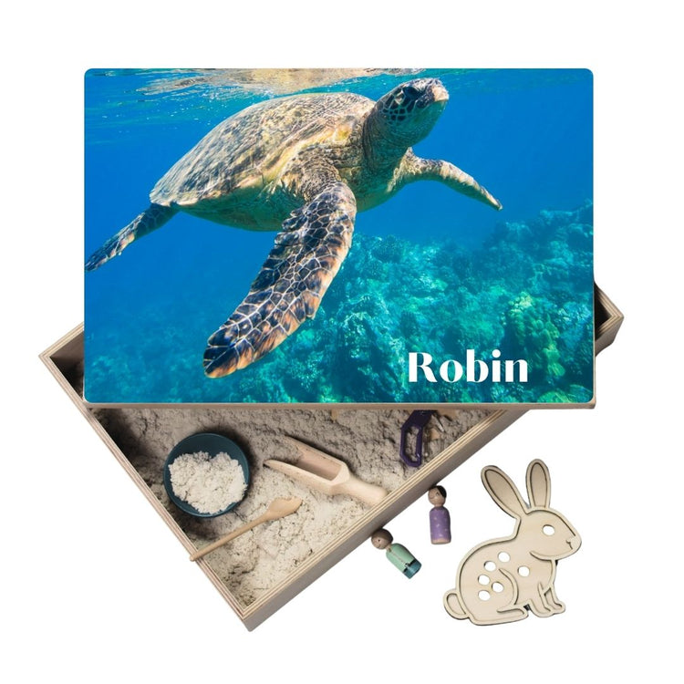 Holz-Spielwanne mit personalisiertem Deckel – Robin (Meeresschildkröte)