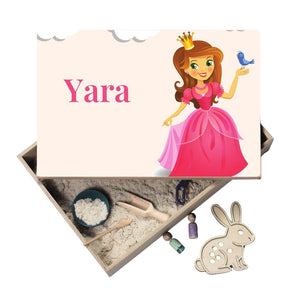 Holz-Spielwanne mit personalisiertem Deckel – Yara (Prinzessin)