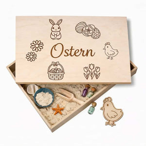 Diese Oster-Spielwanne verbindet Fantasie, Ruhe und saisonales Erleben. Kinder können schaufeln, sieben, verstecken und entdecken – und dabei ihre eigene Osterwelt erschaffen. Perfekt für Zuhause, Kindergarten oder Grundschule.