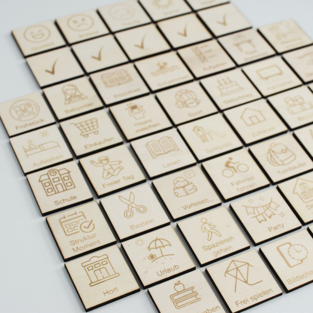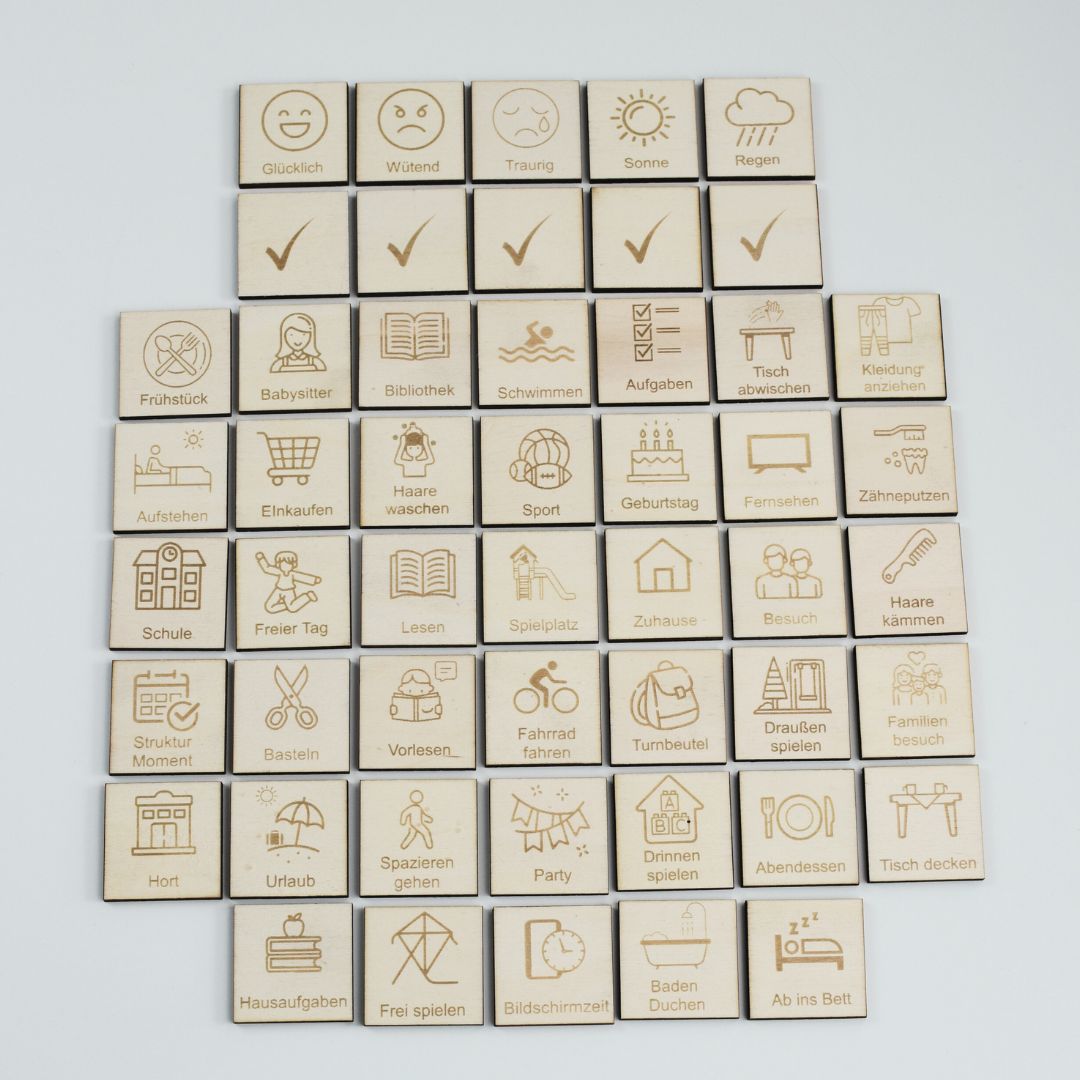 ✔ 40 gravierte Piktogramme (u.a. Aufstehen, Frühstück, Schule, Sport, Einkaufen, Vorlesen, Zähne putzen, Fahrrad fahren, Familienbesuch u.v.m.)