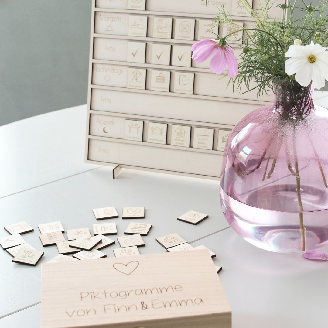 Der Alltag mit Kindern kann voller Überraschungen sein – und manchmal auch unübersichtlich. Unser Holz-Tagesplaner für Kinder bringt Schritt für Schritt Klarheit in den Tag. Mit 46 liebevoll gestalteten Piktogrammen lernen Kinder, den Ablauf ihres Tages zu verstehen und sich sicher zu fühlen.