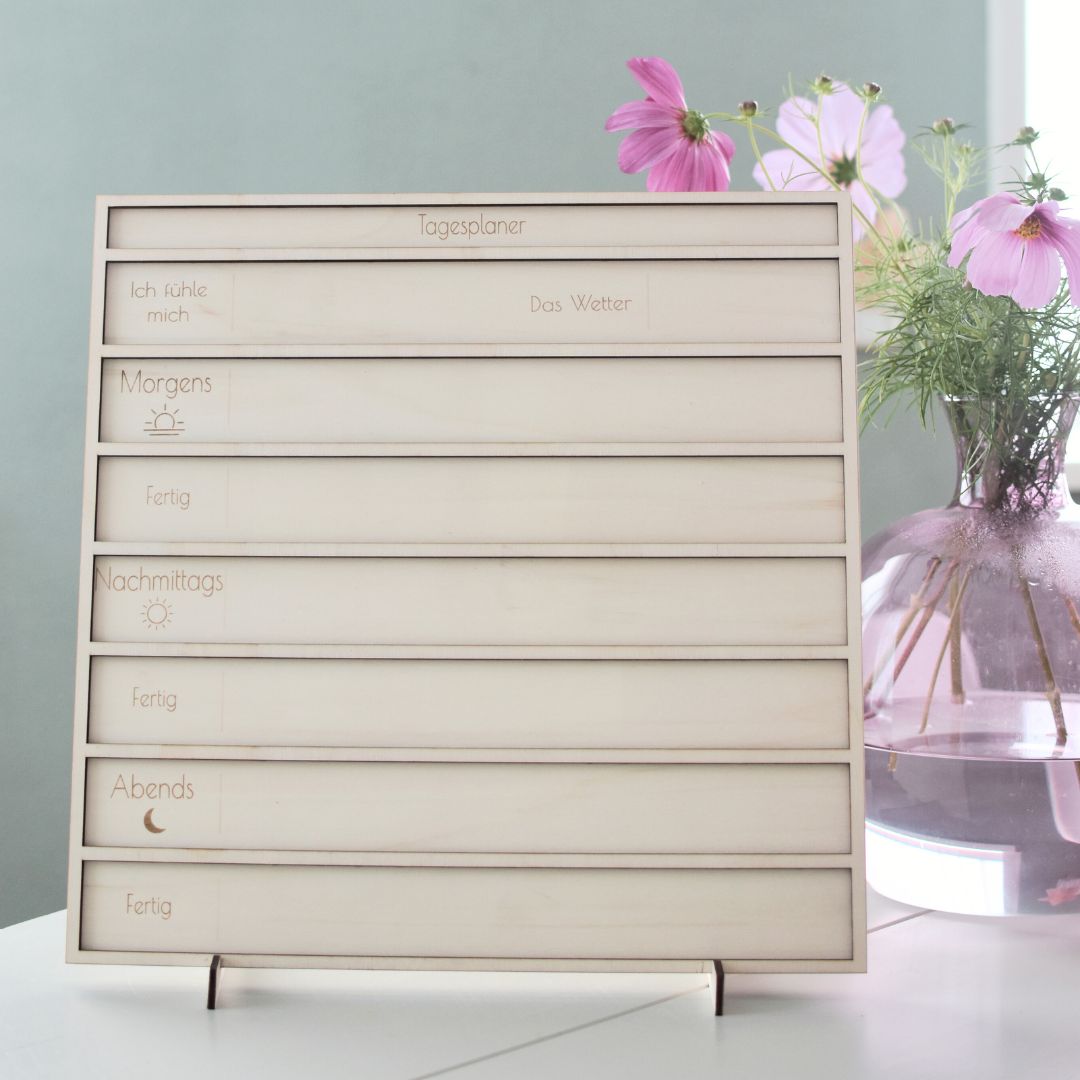Für viele Kinder ist es noch schwierig, eine ganze Woche im Voraus zu planen. Der Tagesplaner aus Holz bietet eine einfache und spielerische Möglichkeit, den Tag gemeinsam zu strukturieren.