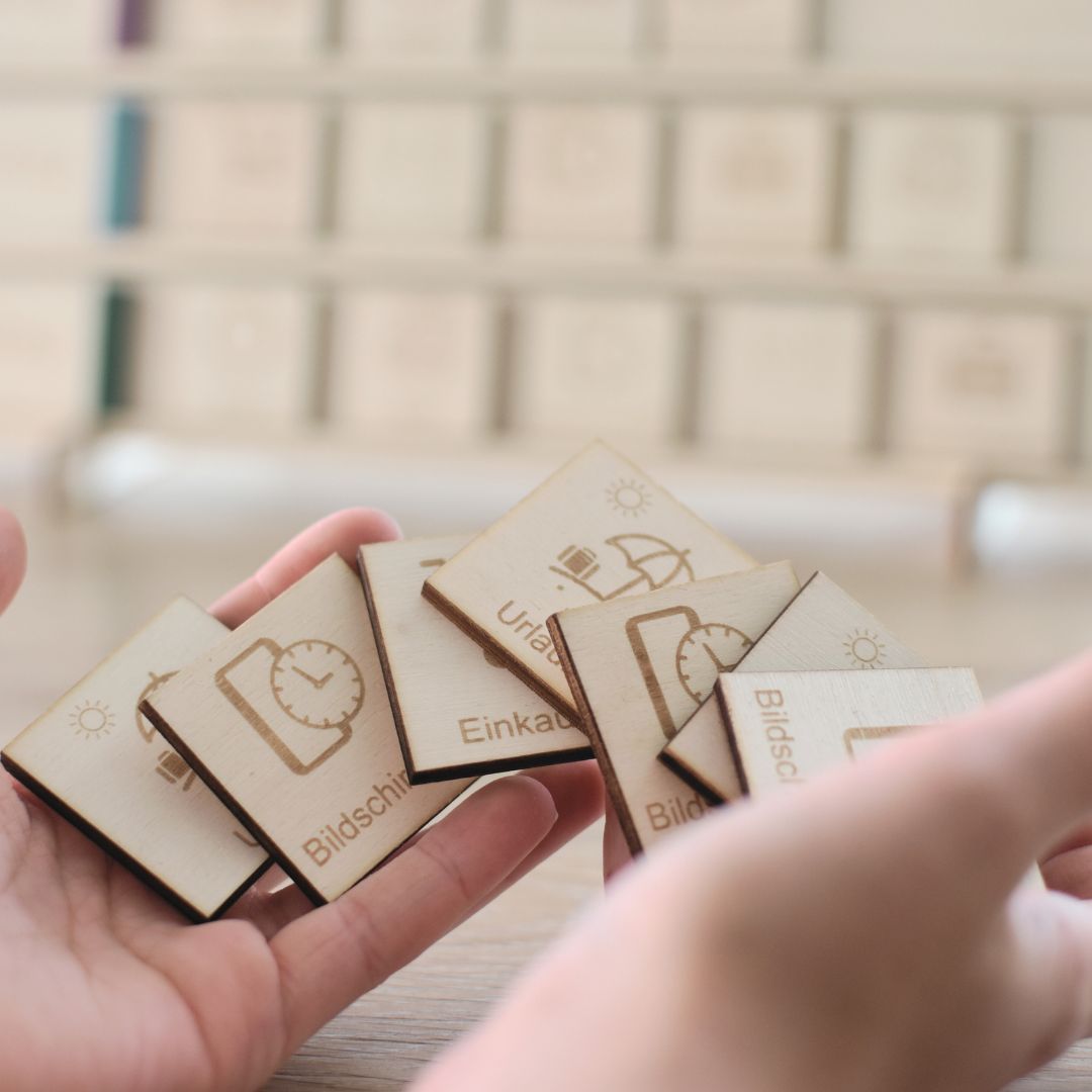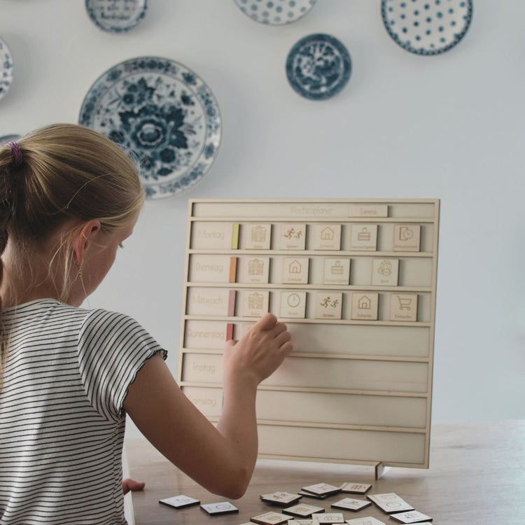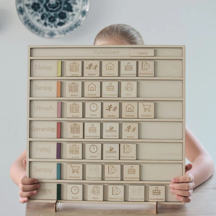 Mit unserem Holz-Wochenplaner und 46 liebevoll gestalteten Piktogrammen erhalten Kinder die Übersicht, die sie brauchen, um ihren Tag und ihre Woche besser zu verstehen. Viele Kinder fühlen sich sicherer, wenn sie wissen, was auf sie zukommt. Dieser Planer hilft ihnen dabei, Kontrolle über ihre täglichen Aktivitäten zu gewinnen – spielerisch, kindgerecht und visuell.