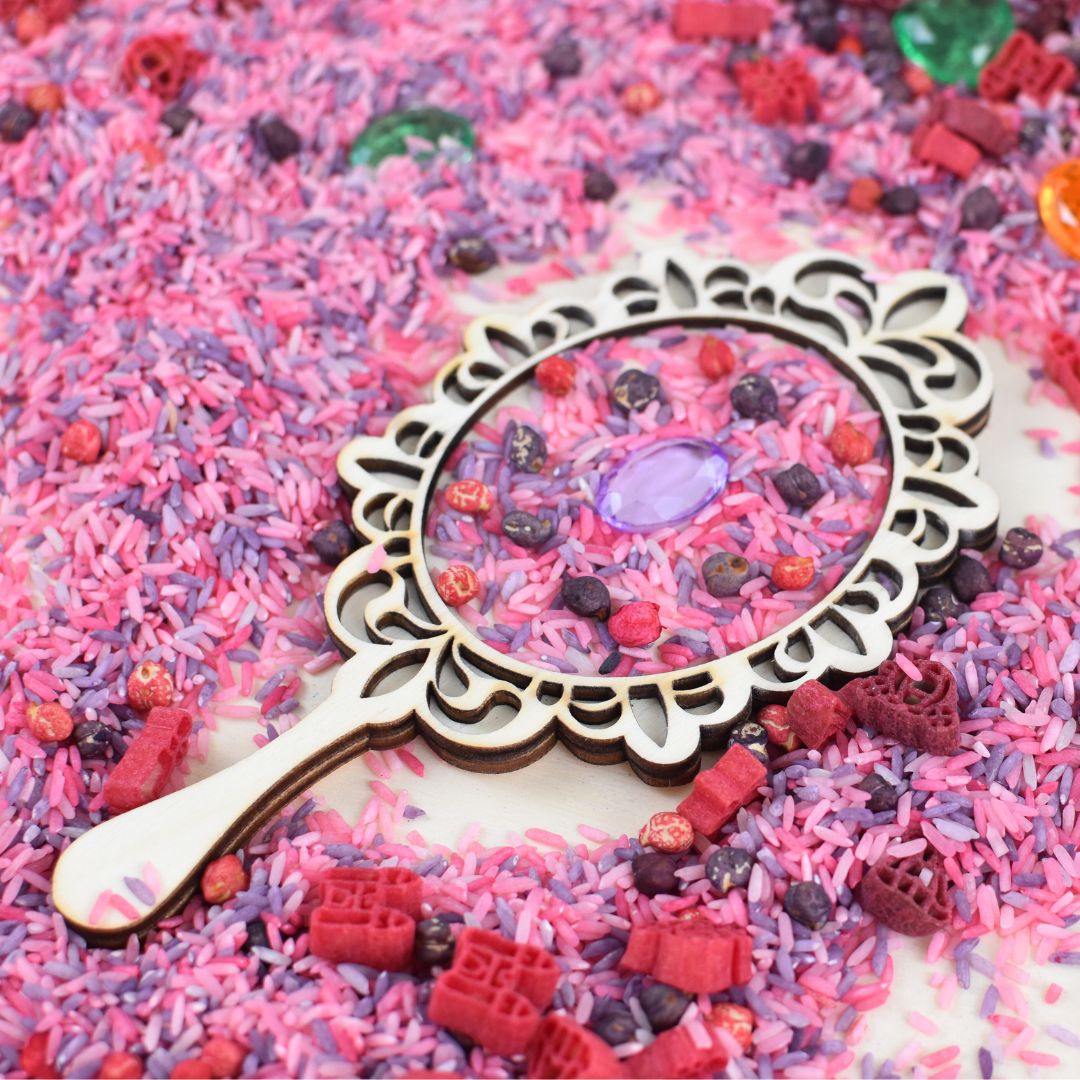 Kombiniere den Spiegel mit unserer Holzspielwanne und dem Prinzessinnenmix für ein vollständiges sensorisches Abenteuer, das Kinder in eine magische Märchenwelt entführt.