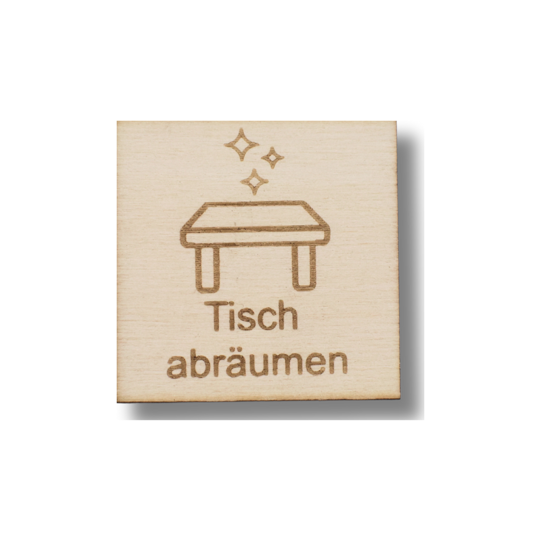 Mit diesem fröhlichen Piktogramm „Tisch abräumen“ kannst du einfach zeigen, wann eine kleine Aufgabe im Haushalt ansteht. Eine praktische Methode, um Kinder in den Haushalt einzubeziehen und diese Tätigkeit in den Wochenplan zu integrieren.