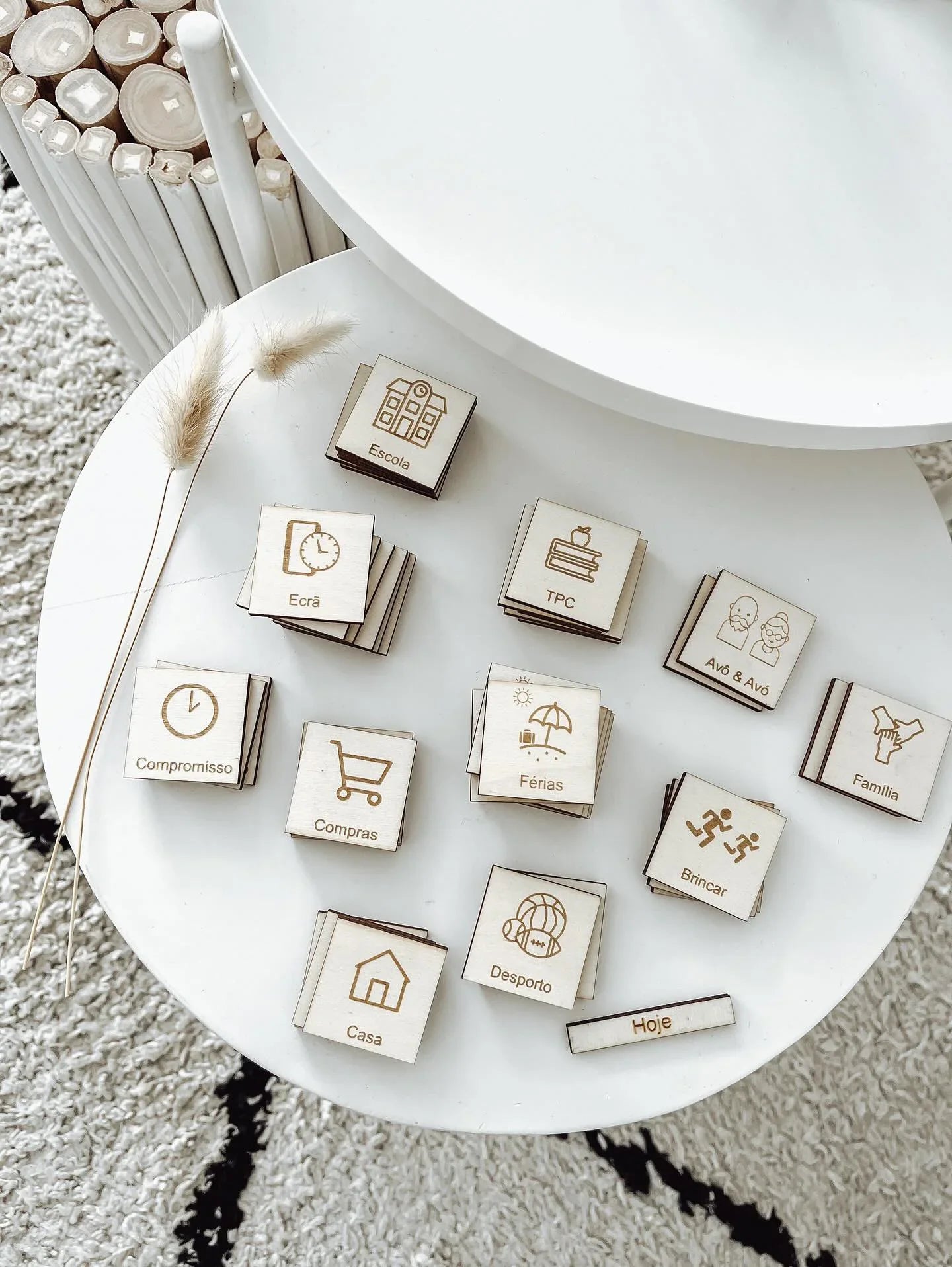 Esta agenda semanal inclui 46 pictogramas, 1 pictograma "hoje" e 2 suportes para configurar a agenda.