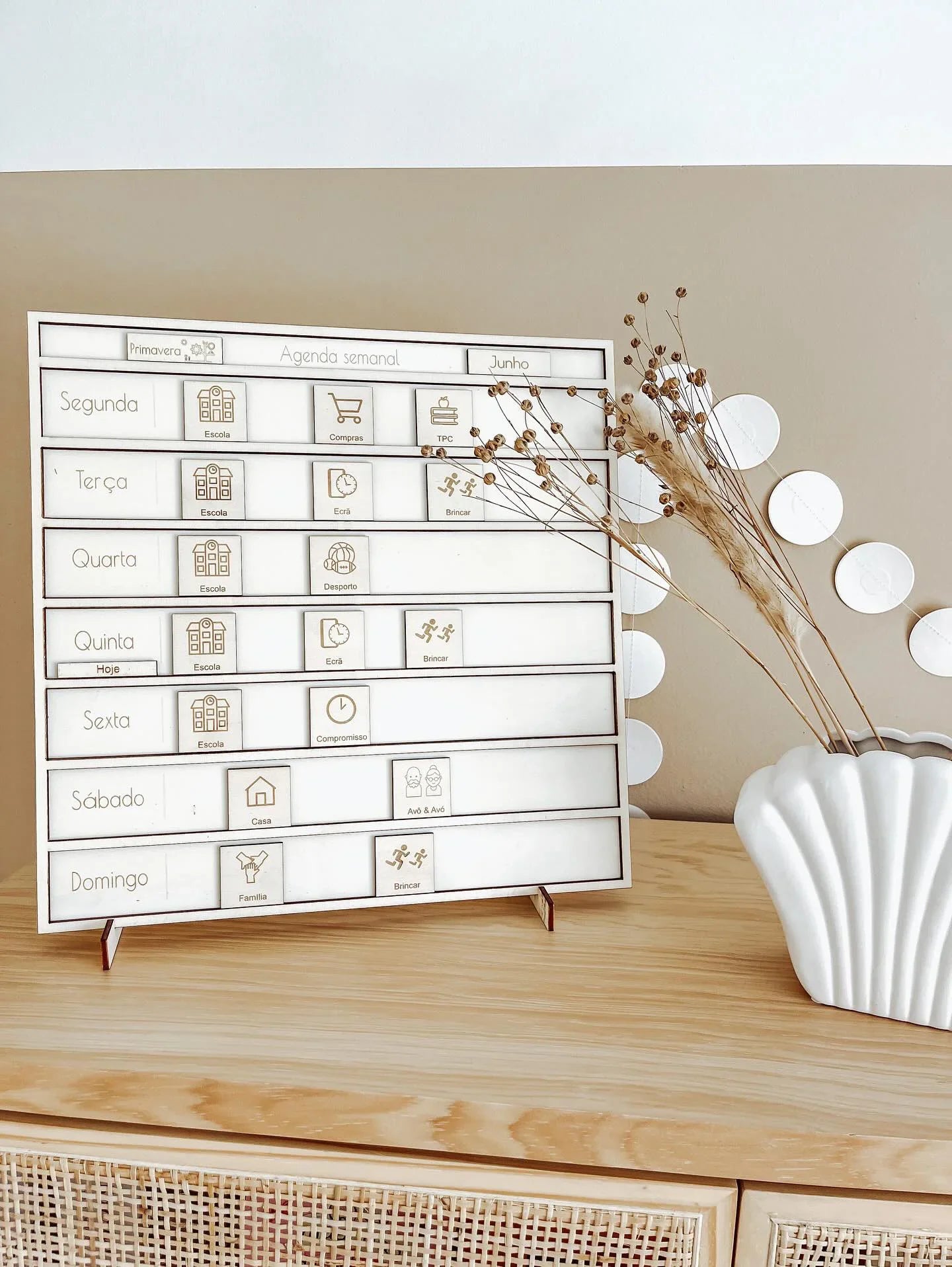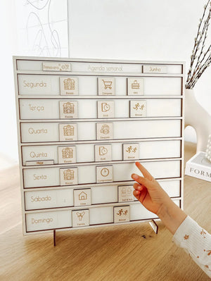 As crianças muitas vezes têm pouca noção do tempo e perguntam frequentemente o que vai acontecer a seguir e quando. Elas gostam de ter controle sobre o seu dia ou semana. Com esta prática agenda semanal, as crianças podem facilmente ter uma visão clara da sua agenda diária e semanal.