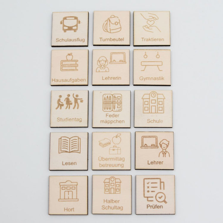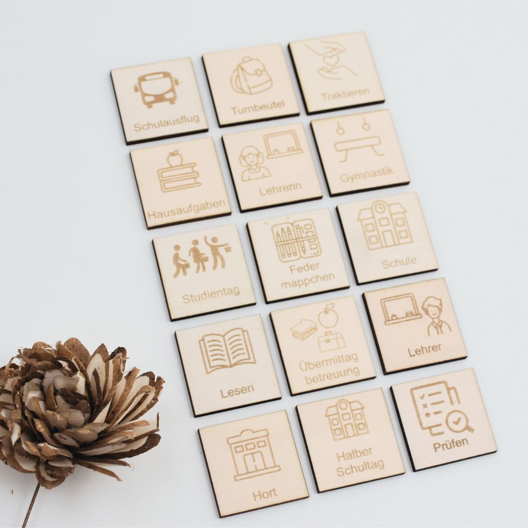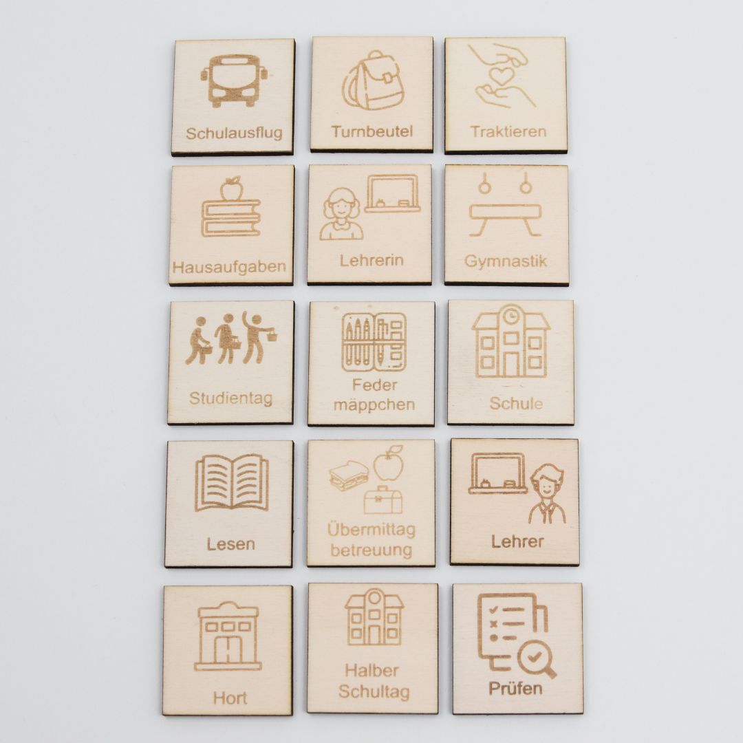Die Lotta ist die kompakte Version unseres Holz-Wochenplaners – ideal für Tages- und Abendroutinen, aber auch perfekt für den Einsatz in der Schule. Dieses Schul-Set Piktogramme unterstützt Kinder dabei, die einzelnen Schritte von Schulaufgaben und Routinen visuell darzustellen und damit strukturierter, schrittweise und selbstständiger zu arbeiten.