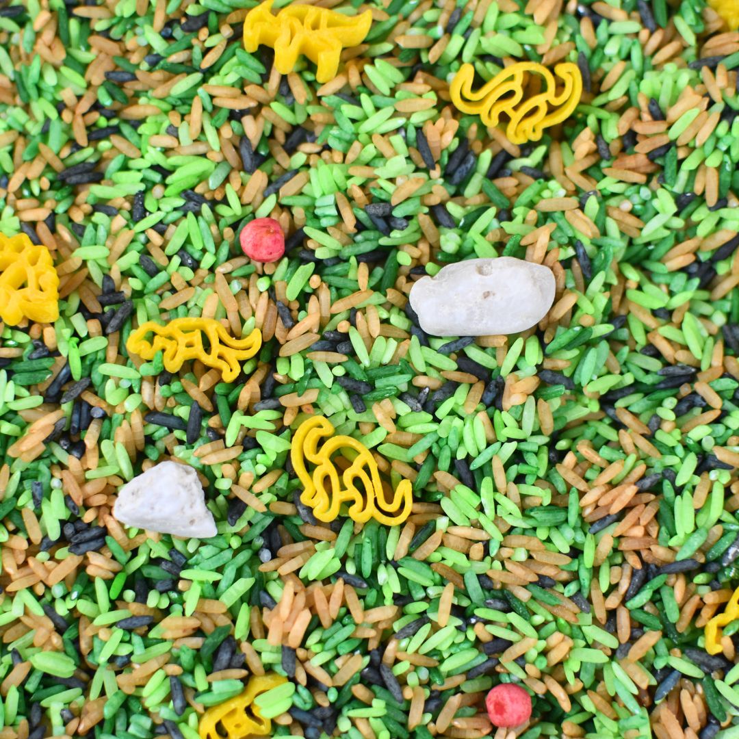 Die Dino-Mix bietet ein sinnliches Erlebnis (Sensory Play), das Kindern hilft, ihren Tastsinn zu erforschen und ihre Konzentration zu steigern. Das Fühlen verschiedener Texturen, das sanfte Rascheln des Reises und die lebendigen Farben sorgen für ein komplettes Sinnesabenteuer. Ideal, um Ruhe und Fokus während des Spielens zu fördern.