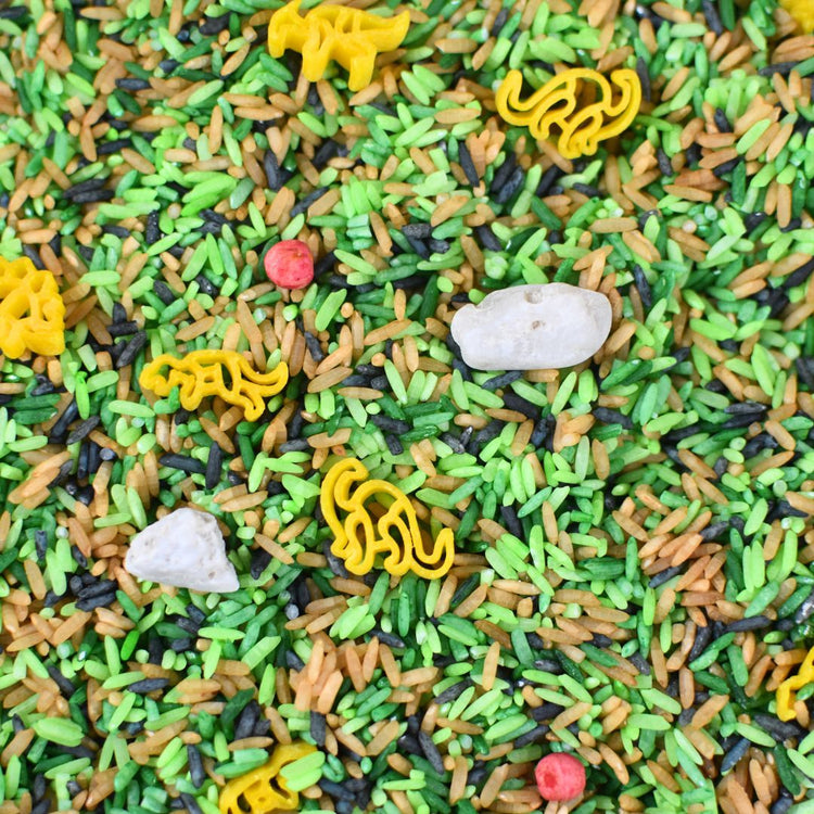 Lassen Sie Kinder die magische Welt der Dinosaurier mit unserer spannenden Dino-Mix erkunden! Perfekt für die Holz-Spielwanne oder fantasievolle Spielstunden. Diese Mix bringt die Urzeit zum Leben mit verschiedenen Grüntönen von Spielreis, kleinen Holz-„Fossilien“-Scheiben, Mini-Vulkansteinen und Nudeln in Knochenform. Kinder werden begeistert sein vom Graben, Sortieren und Erfinden eigener Dino-Abenteuer – und dabei spielerisch Feinmotorik und Vorstellungskraft entwickeln.
