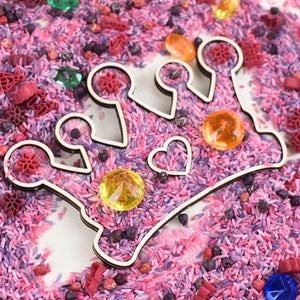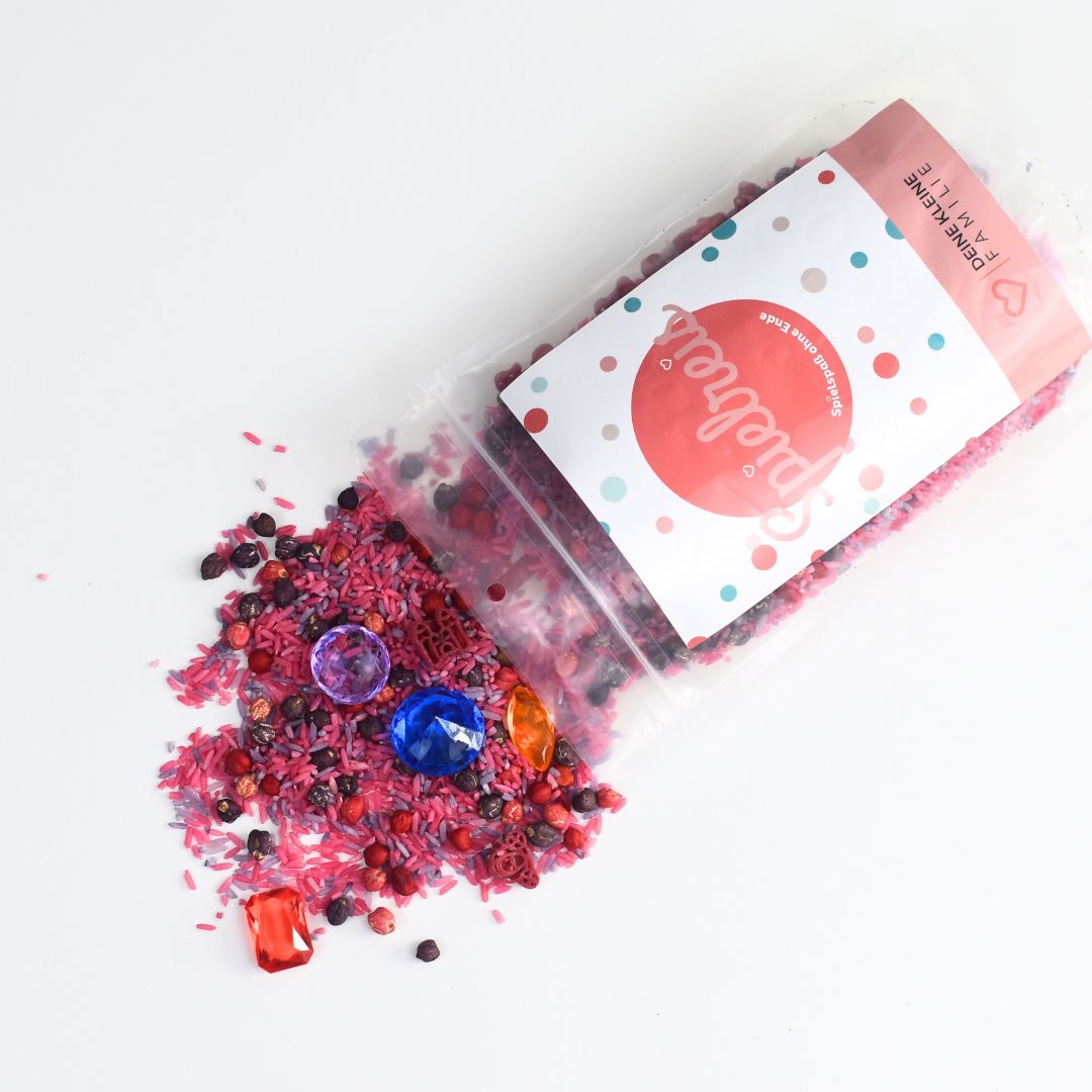 Kinder entdecken mit unserem zauberhaften Prinzessinnen-Mix die Magie eines Märchenreichs. Perfekt für die Holz-Spielkiste oder kreative Spielstunden. Die Mischung vereint rosafarbenen und lilafarbenen Spielreis, glitzernde Edelsteine und Nudeln in Kronen- und Schlossform.