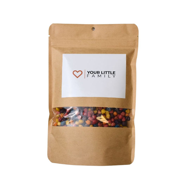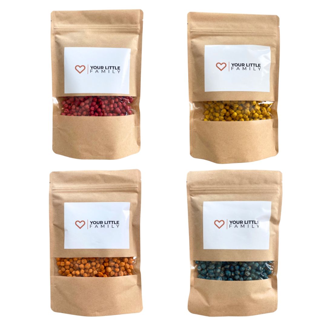 Jeder Beutel enthält 250 Gramm fröhlich bunte Erbsen, bereit für stundenlangen Spielspaß in Kombination mit unseren Spielwannen und Zubehörteilen.