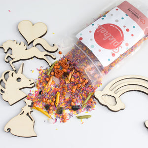 - Wählen Sie jetzt aus vier verschiedenen Holz-Füllformen: regenbogen, einhorn en Herz