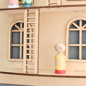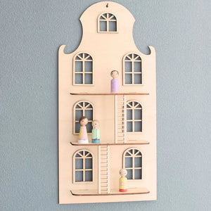 Dieses stilvolle Wand-Puppenhaus in Form eines klassischen Grachtenhauses ist ein echter Blickfang. Mit drei Etagen, verspielten Fensterformen und hölzernen Leitern bietet es unzählige Möglichkeiten für fantasievolles Spielen und liebevolle Dekorationen im Jahreslauf.