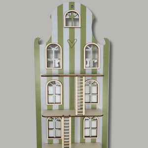 Lass Fantasie und Atmosphäre zusammenkommen in diesem besonderen Wandpuppenhaus mit fröhlichen grün-weißen Streifen. Die klassische Form eines Grachtenhauses, kombiniert mit frischen, modernen Farben, macht dieses Haus zu einem echten Blickfang. Dank der drei Etagen, hölzernen Ablagen und Leitern entsteht viel Raum für Geschichten, Spielfiguren und saisonale Dekorationen.