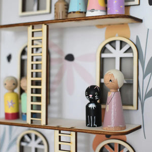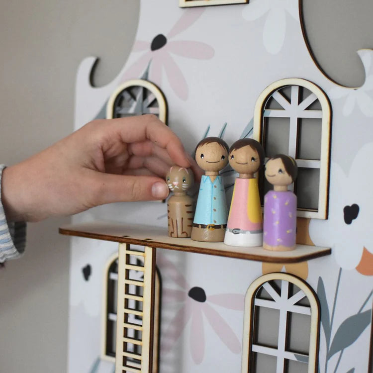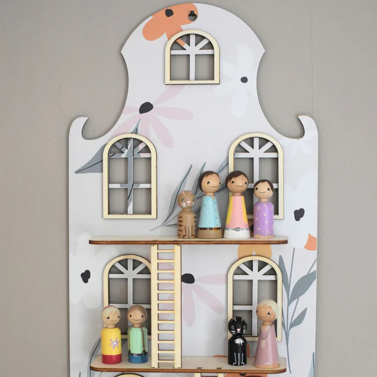 Lass Fantasie und Atmosphäre miteinander verschmelzen in diesem besonderen Wandpuppenhaus mit zartem Blumenprint. Die klassische Form eines Grachtenhauses, kombiniert mit modernen Details, macht dieses Haus zu einem echten Blickfang. Dank der drei Etagen, hölzernen Ablagen und Leitern entsteht viel Raum für Geschichten, Spielfiguren und saisonale Dekorationen.